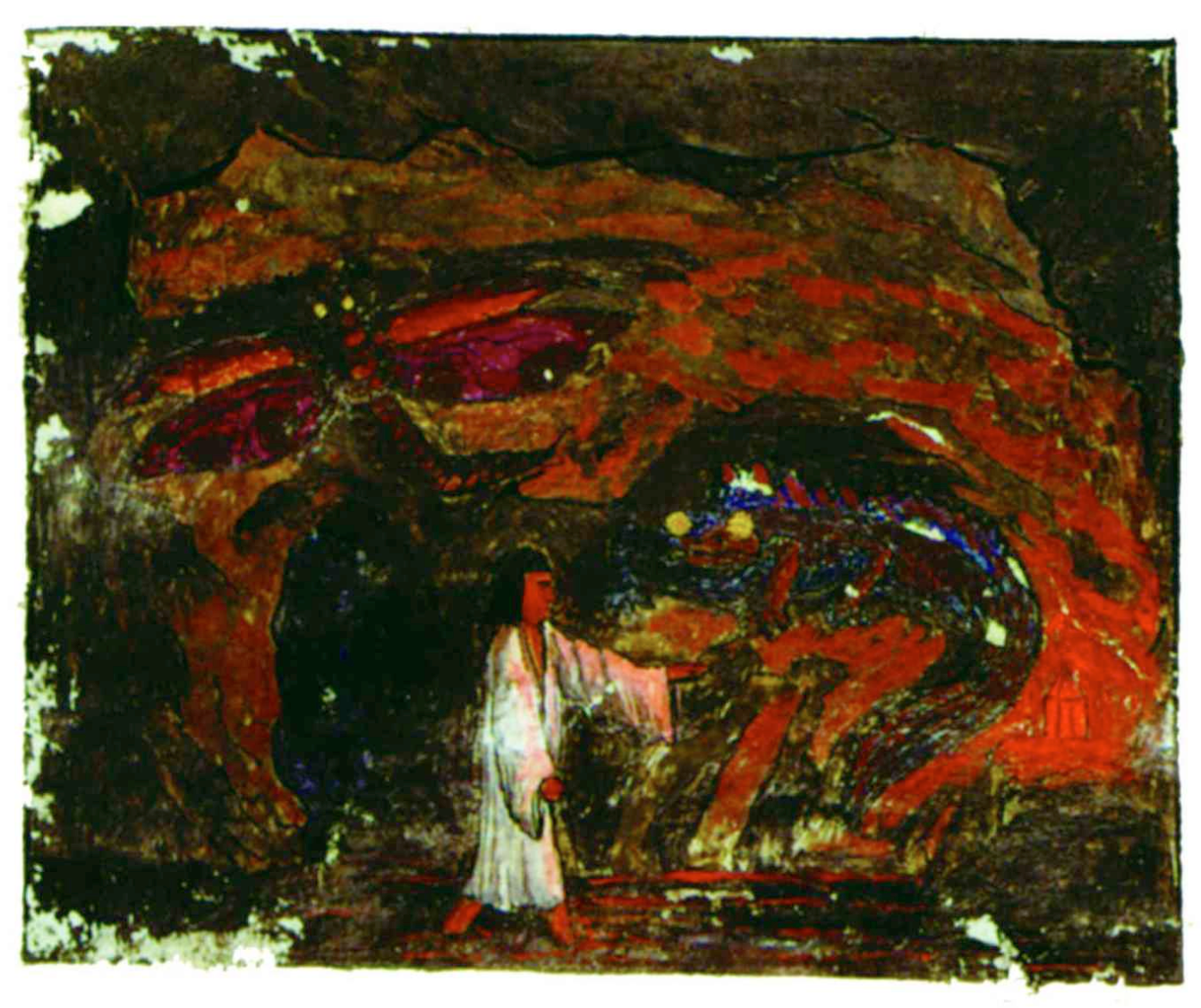 - 基督被钉死在十字架上之后进入阴间,变成地狱。因此他披上反基督的外衣,也就是恶龙。反基督人这个意象由古人流传下来,宣告新神的诞生,古人已经预见新神的到来。