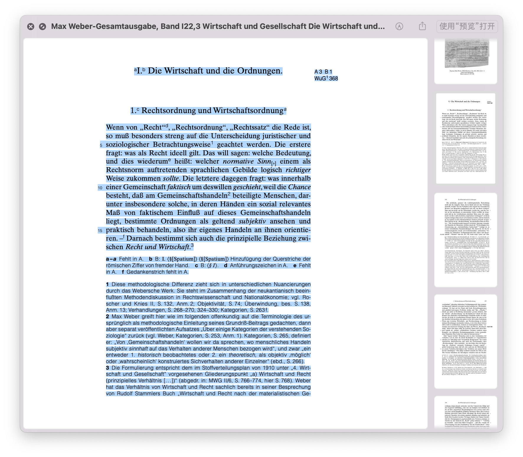 🚨 为了确保zeno.org的版本是德语原版无偏差,没有什么幺蛾子.我在另一个看起来更学术的网站上下载了对应章节的书,上面甚至有马克思韦伯本人的笔记 Max Weber-Gesamtausgabe, Band I/22-1,3 Wirtschaft und Gesellschaft Die Wirtschaft und die gesellschaftlichen Ordnungen und... (Werner Gephart, Siegfried Hermes (eds.)) 马克斯·韦伯全集,第I/22卷,第3部分:经济与社会 - 经济与社会秩序及...(韦纳·格普哈特,齐格弗里德·赫尔默斯 编辑) 当然,第I/22卷的第1,2部分我也下载下来了,也翻译了一下.都是前言和编者的话,基础概念什么的一大堆啰里八嗦. 感觉马克思韦伯真是德国人的国宝…研究跟保护的这么多.