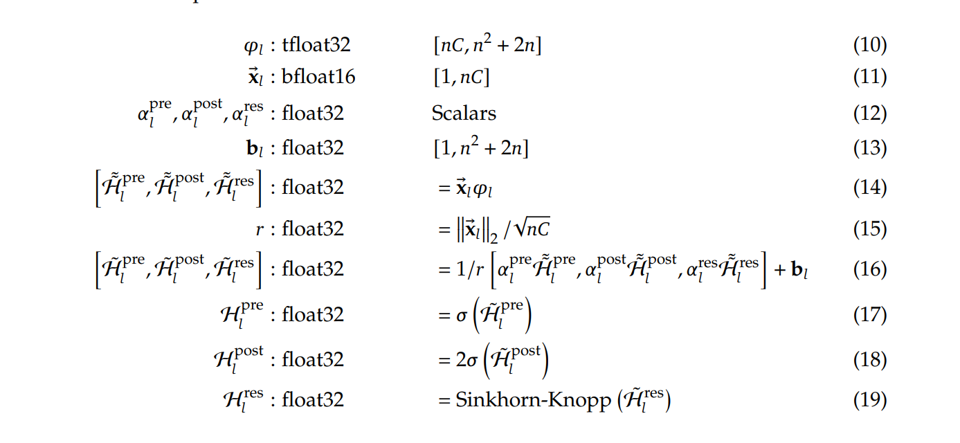 1. Sinkhorn投影中的行/列归一化算子 | Sinkhorn迭代融合内核 | 在一个内核中,连续、原地完成矩阵的行求和与缩放、列求和与缩放,避免中间矩阵反复读写全局显存。 |